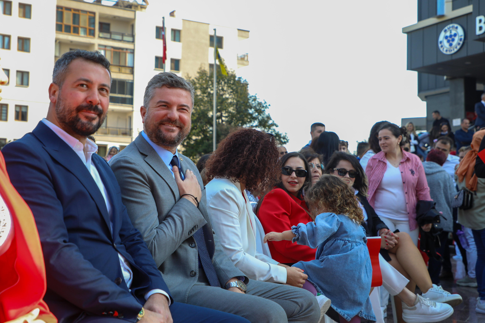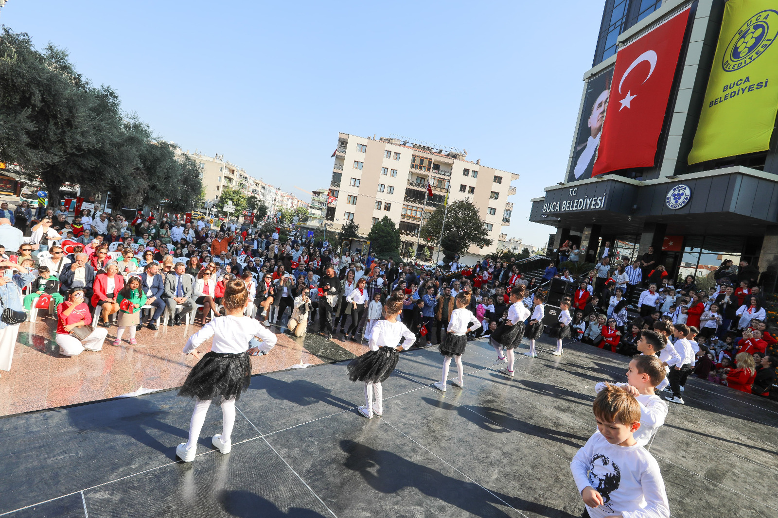 Buca'da Cumhuriyet Bayramı'nın 101. yılı kapsamında düzenlenen kutlamalar devam ediyor. Buca Belediyesi iştirakı BUCAMAR’ın Vali Rahmi Bey, Betontaş ve Çamlıkule Çınar Anaokulları'nda eğitim gören minikler, Cumhuriyet Bayramı'nı coşku içerisinde kutladı. Buca Belediyesi’nin ana hizmet binası önünde gerçekleştirilen törende birbirinden güzel performanslar sunan öğrenciler, en büyük alkışı Buca Belediye Başkanı Görkem Duman'dan aldı.