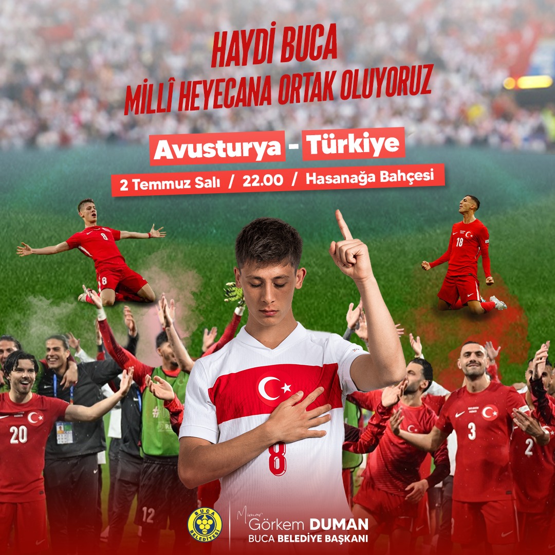 Bucalılar, A Millî Futbol Takımı’nın Avusturya ile karşılaşacağı maçı dev ekranda izleyecek. Buca Belediye Başkanı Görkem Duman, tüm İzmirlileri Hasanağa Bahçesi’nde millî maç heyecanına ortak olmaya davet etti.