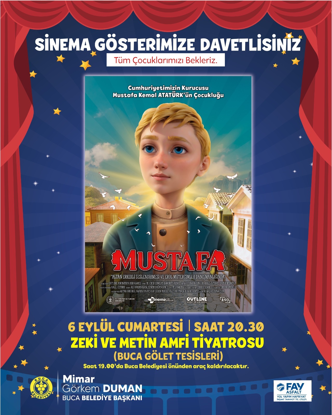 Buca Belediyesi, yeni eğitim öğretim dönemi öncesinde Türkiye Cumhuriyeti’nin kurucusu Gazi Mustafa Kemal Atatürk’ün çocukluğunu anlatan “Mustafa” filmi gösterimi düzenleyecek. Gösterim, 6 Eylül Cumartesi günü saat 20.30’da Buca Gölet Tesisleri Zeki & Metin Amfi Tiyatro’da gerçekleştirilecek. Etkinliğe katılmak isteyen çocuklar ve aileleri için saat 19.00’da Buca Belediyesi önünden ücretsiz servis kaldırılacak.