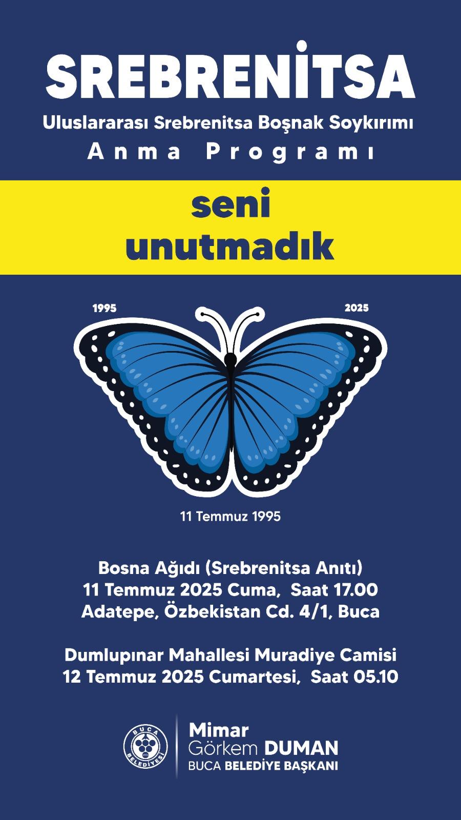 Buca Belediyesi, 11 Temmuz 1995'de Avrupa'nın tam göbeğinde tüm dünyanın seyirci kalarak izlediği Srebrenitsa Soykırımı'nın yıl dönümünde, yitirilen 8 bin 372 can için anma töreni düzenleyecek. Adatepe Mahallesi'nde bulunan Srebrenitsa Anıtı önünde gerçekleşecek tören, saat 17.00’de başlayacak. Saygı duruşunun ardından Bosna Hersek Millî Marşı ve İstiklal Marşı okunacak. Bosna Hersek’ten gelen üniversite öğrencisi Dzemal Krkalic; Rojay, Gorajde, Tutin ve İpek kardeş belediyeleri adına bir konuşma yapacak. Buca Belediye Başkanı Mimar Görkem Duman’ın konuşmasının ardından “Mavi Kelebeklerin Başkenti” oratoryosu sunulacak. Tören, katılımcıların anıta zambak ve karanfiller bırakması ile son bulacak. Ayrıca alanda katılımcılara, soykırımın simgesi olan “mavi kelebek” rozeti dağıtımı yapılacak. Bu yılki anma programına Karadağ, Bosna Hersek, Kosova ve Sırbistan’dan gelen Boşnak gençler de katılım sağlayacak.12 Temmuz Cumartesi günü saat 05.10’da ise Dumlupınar Mahallesi’ndeki Muradiye Camisi’nde dua ve ikram programı düzenlenecek.