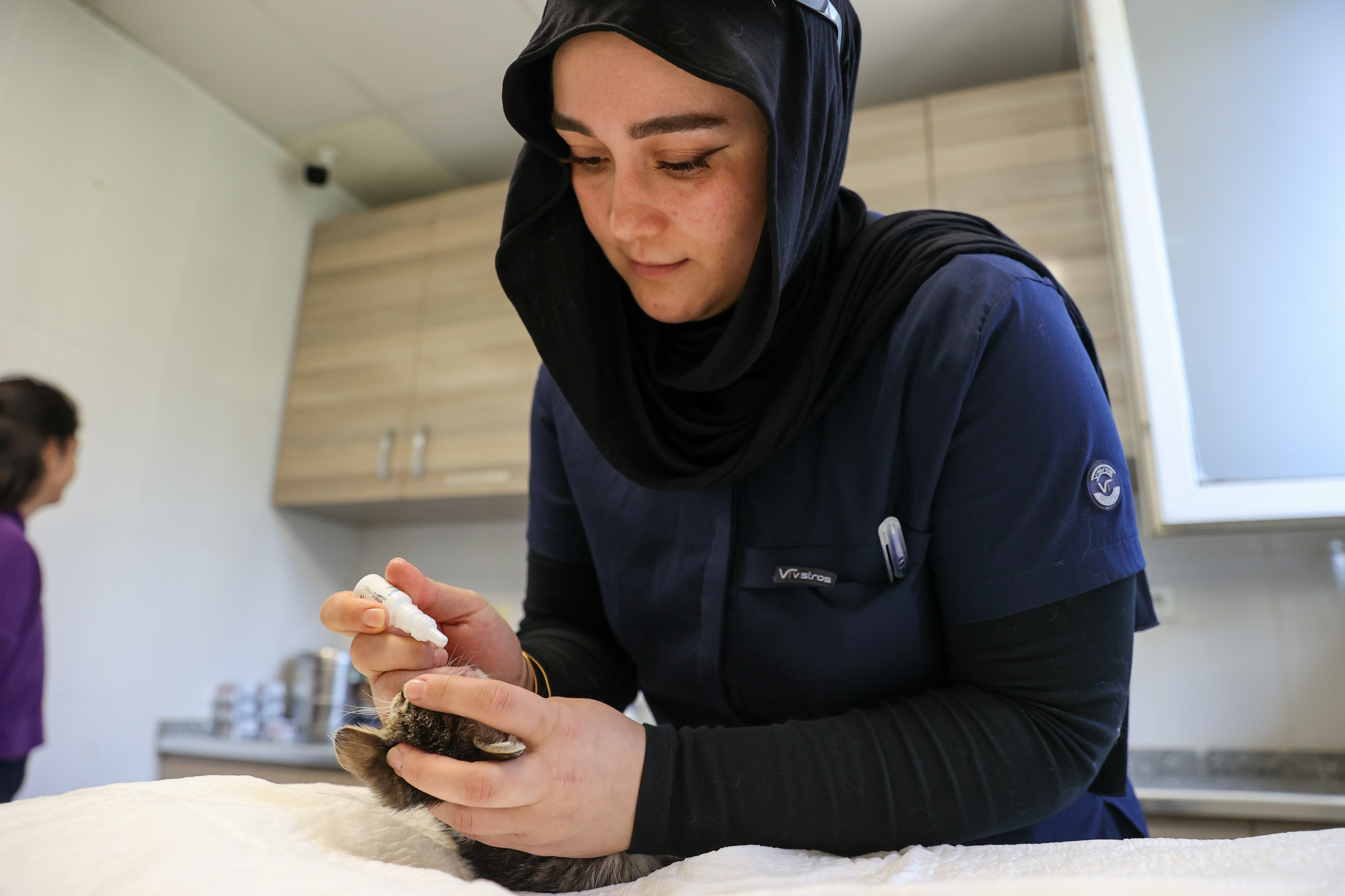 Vatandaşlar tarafından merkeze ulaştırıldığında yaşama şansı oldukça düşük olan yavru kedinin, kapıya sıkışma sonucu boynunun kırıldığı belirlendi. Hemen yoğun bakıma alınan ve titizlikle tedavi edilen can dostu için özel bir fizik tedavi süreci başlatıldı. Gün boyu enjeksiyon ve tıbbi müdahaleleri yapılan minik kedi, özel bakım ihtiyacı nedeniyle mesai bitiminde de yalnız bırakılmıyor. Hayata yeniden başladığı için sağlık personeli tarafından “Zero” ismi verilen kedi, gecelerini de sağlık personelinin evinde geçiriyor.