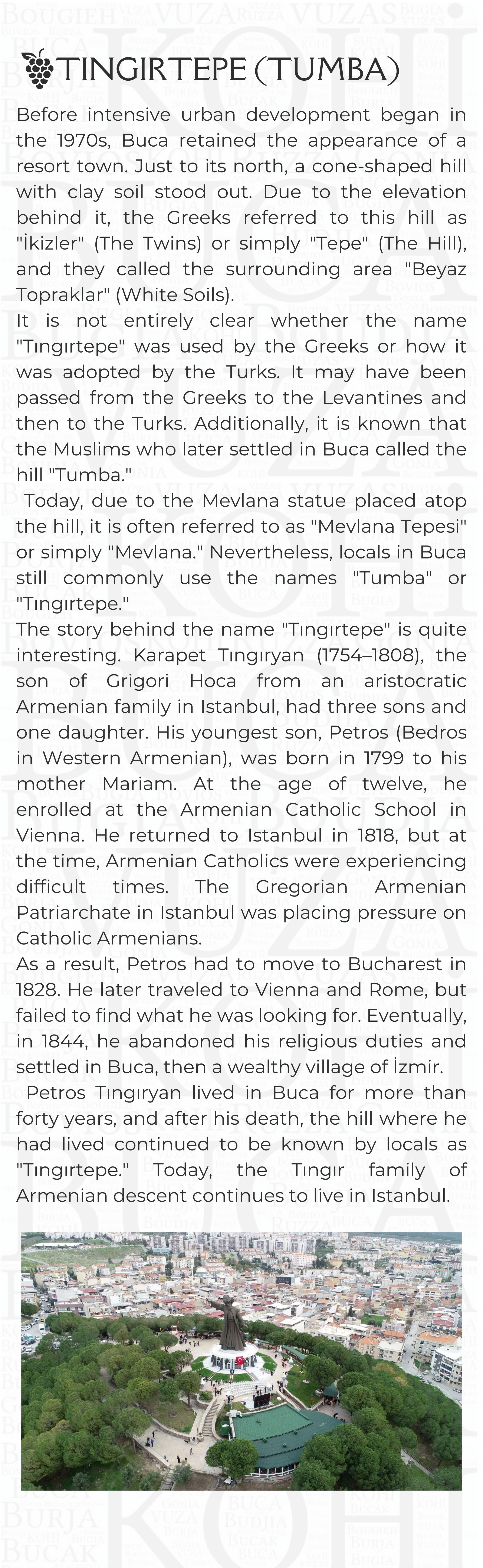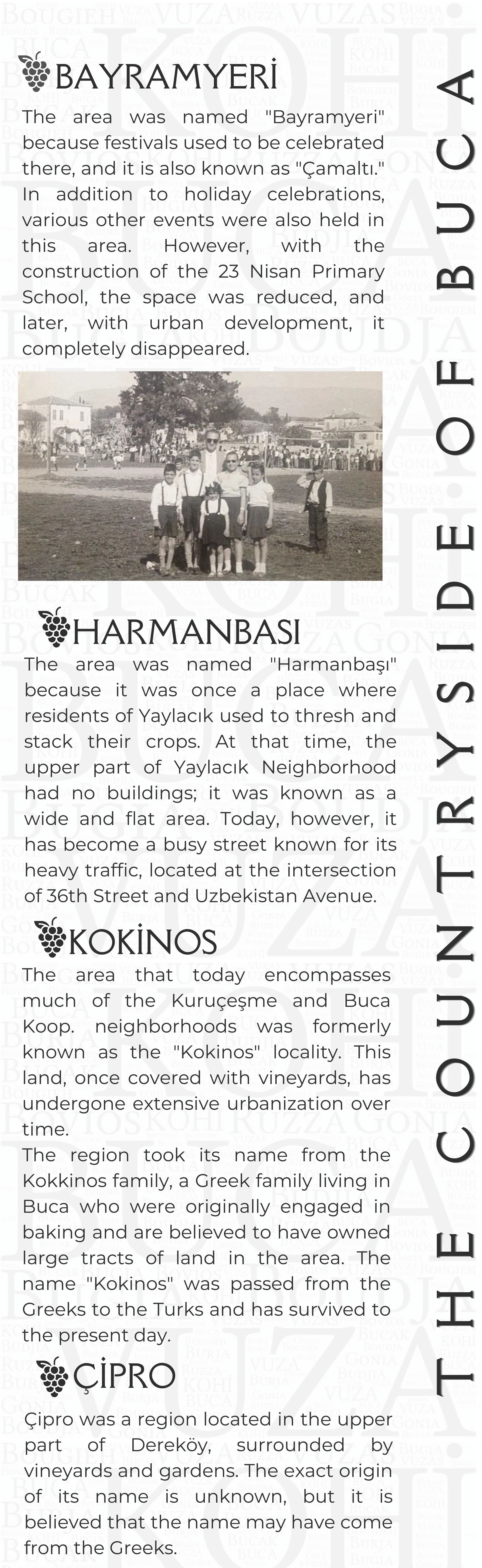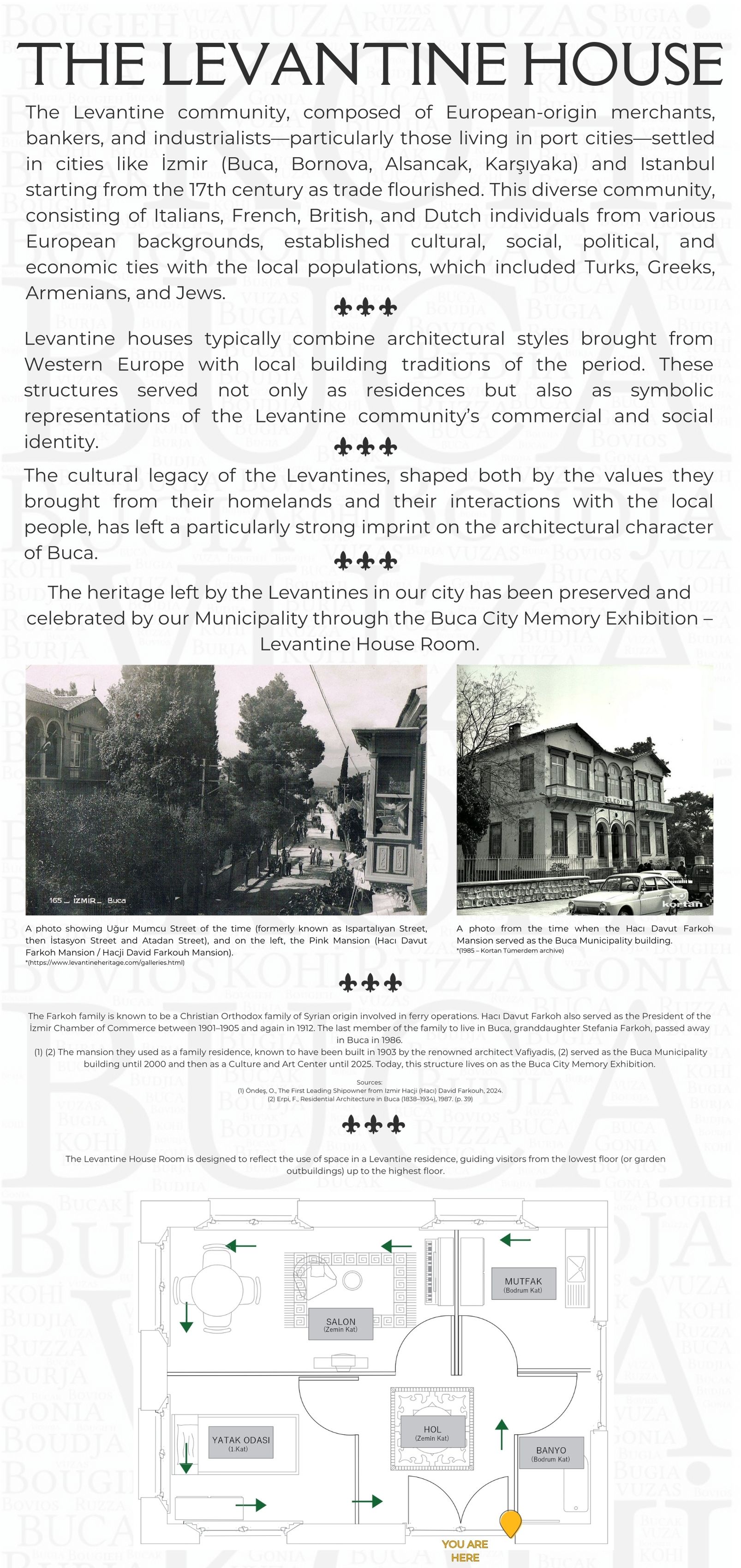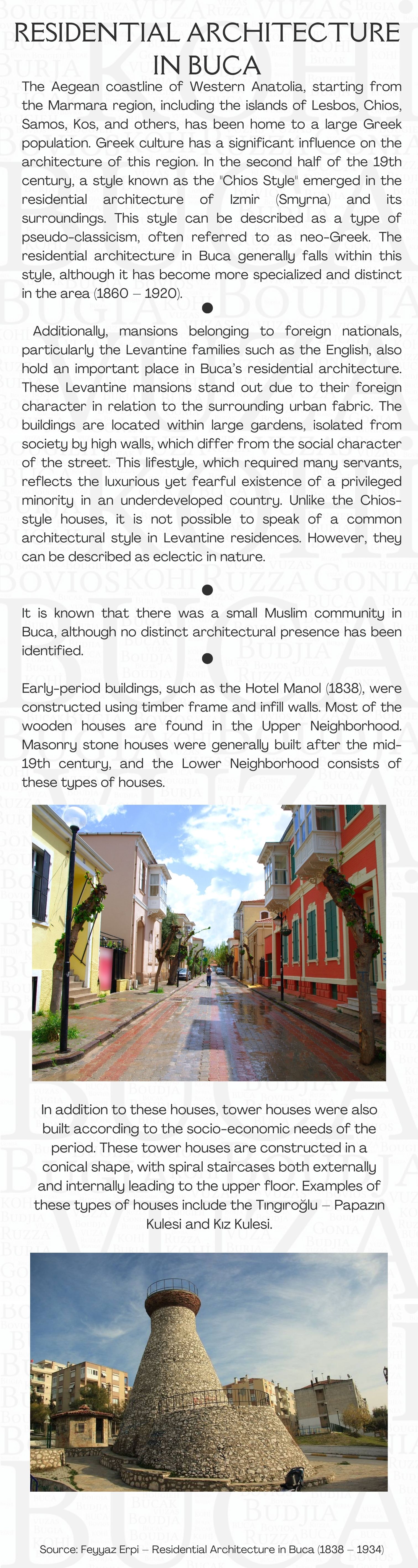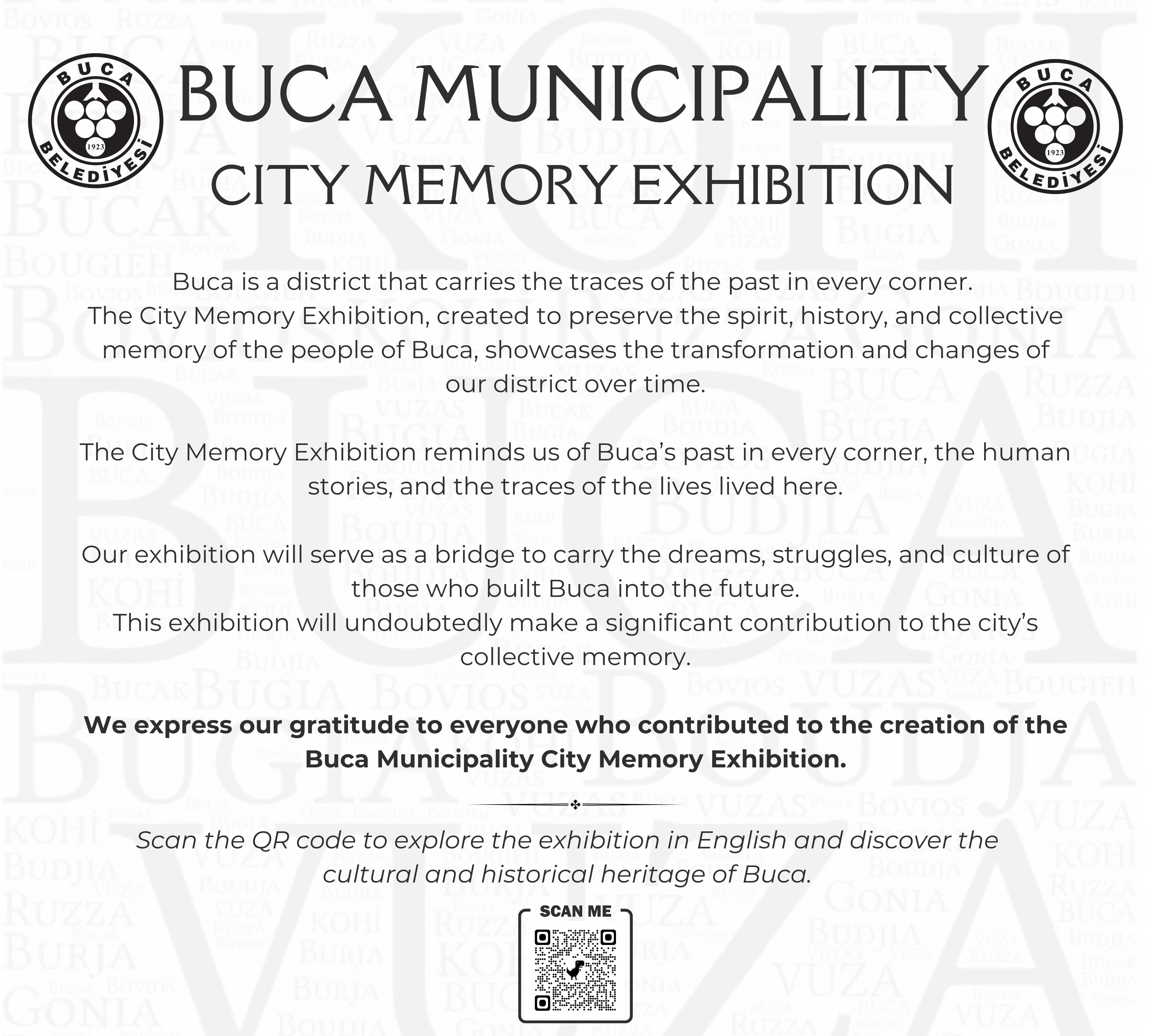 Proje Detayı : Buca'nın kentsel belleğinde izi olan yapıların, değerlerin, eserlerin bu mirası tanıtmak ve yaşatmak amacıyla Pembe Köşk (Buca Belediyesi Kültür Sanat Merkezi) yapısının giriş katında sergilenmek üzere mekanın yerleşiminin ve sergi araçlarının tasarlanması ile içeriklerinin oluşturulması Kentsel Tasarım Müdürlüğü ile birlikte yapılmaktadır.