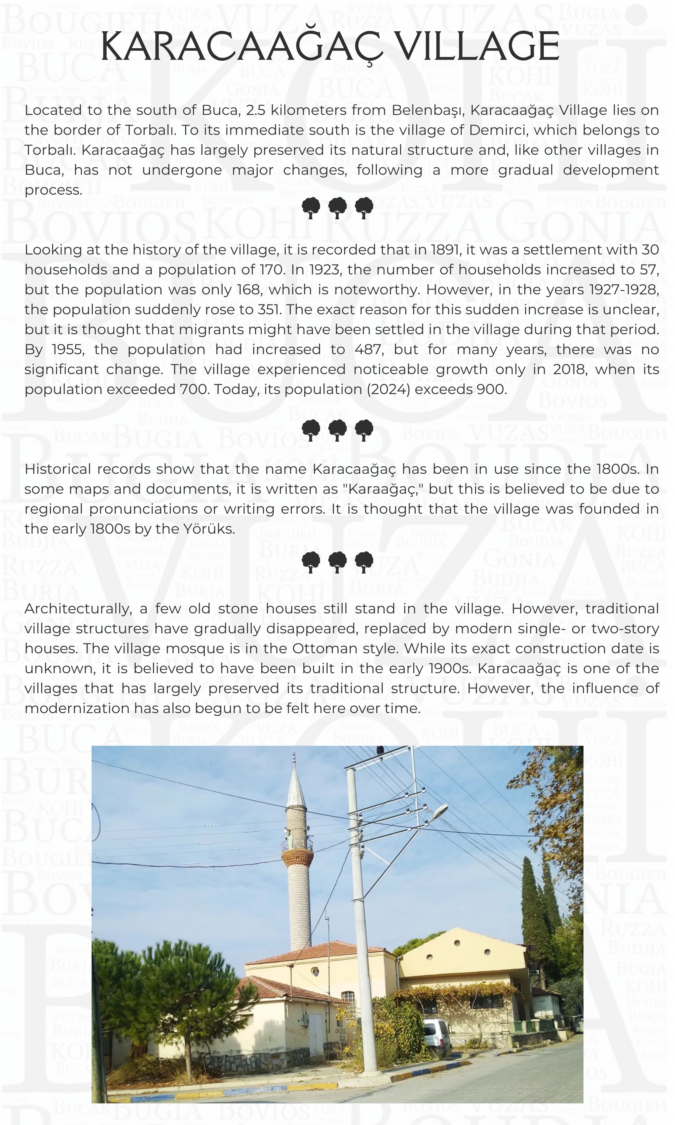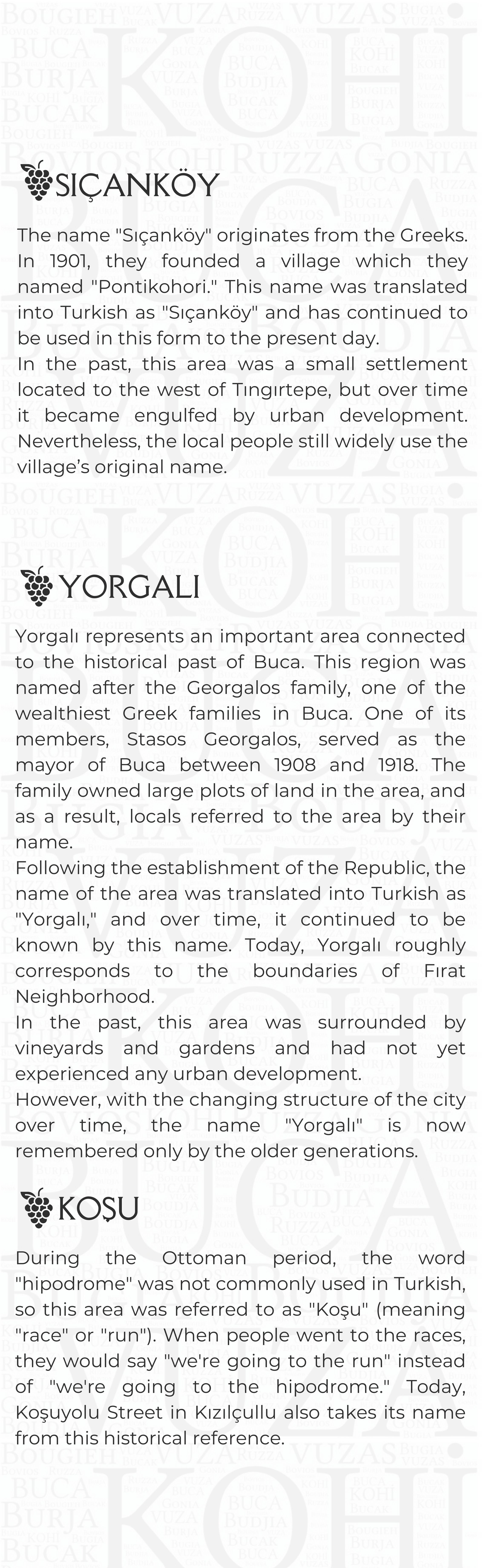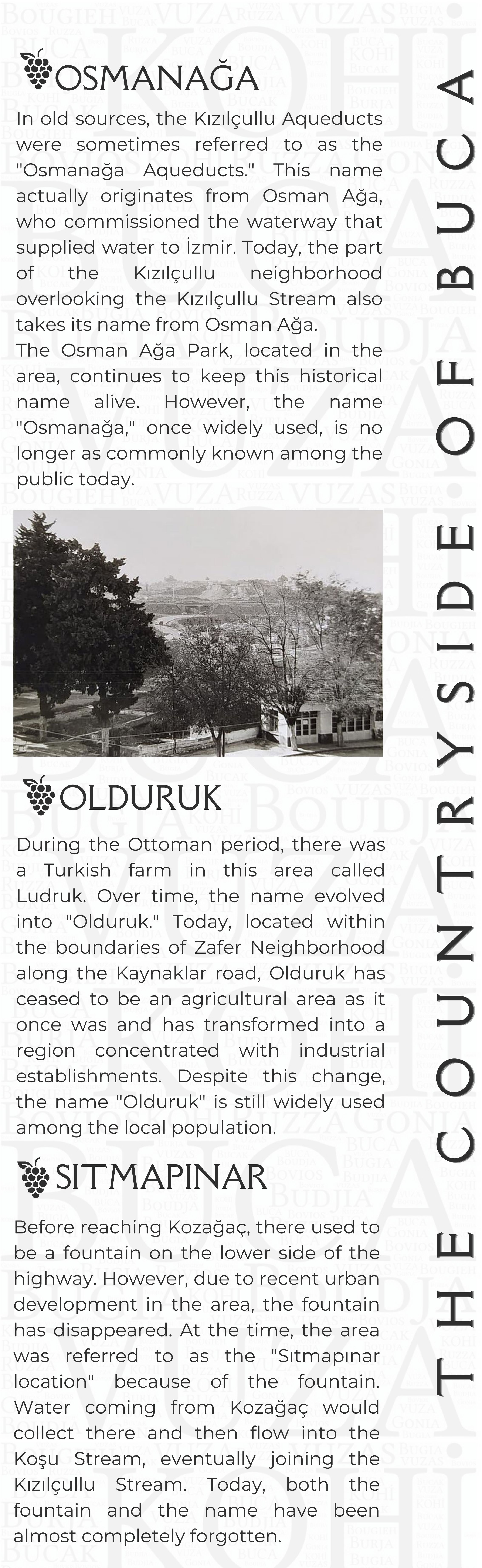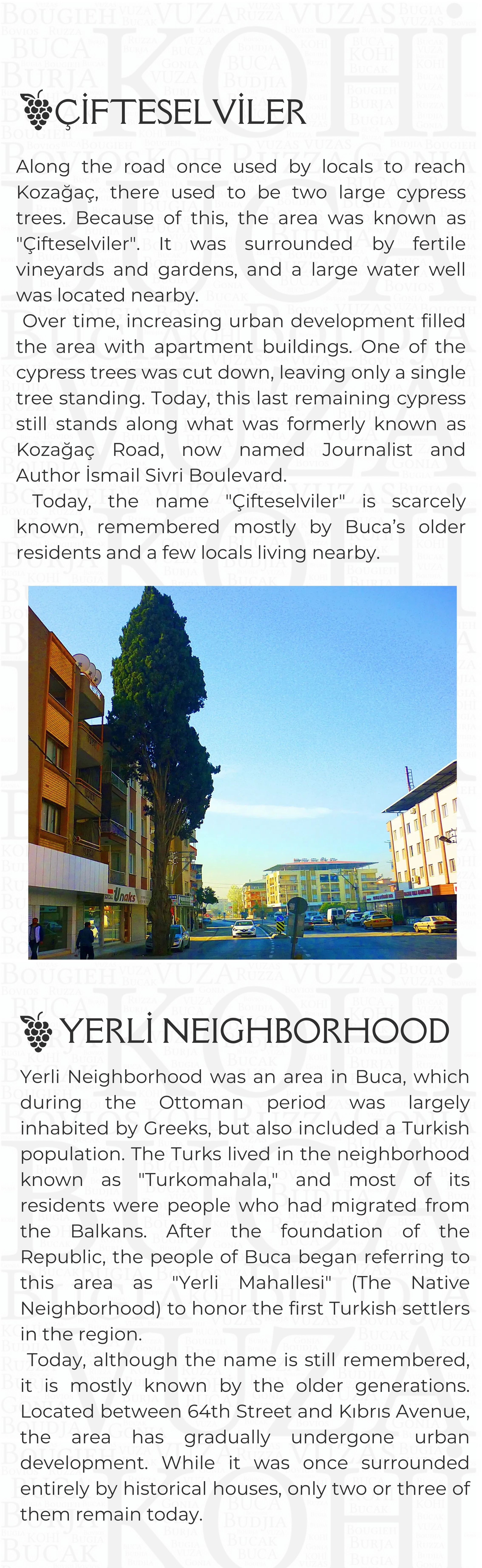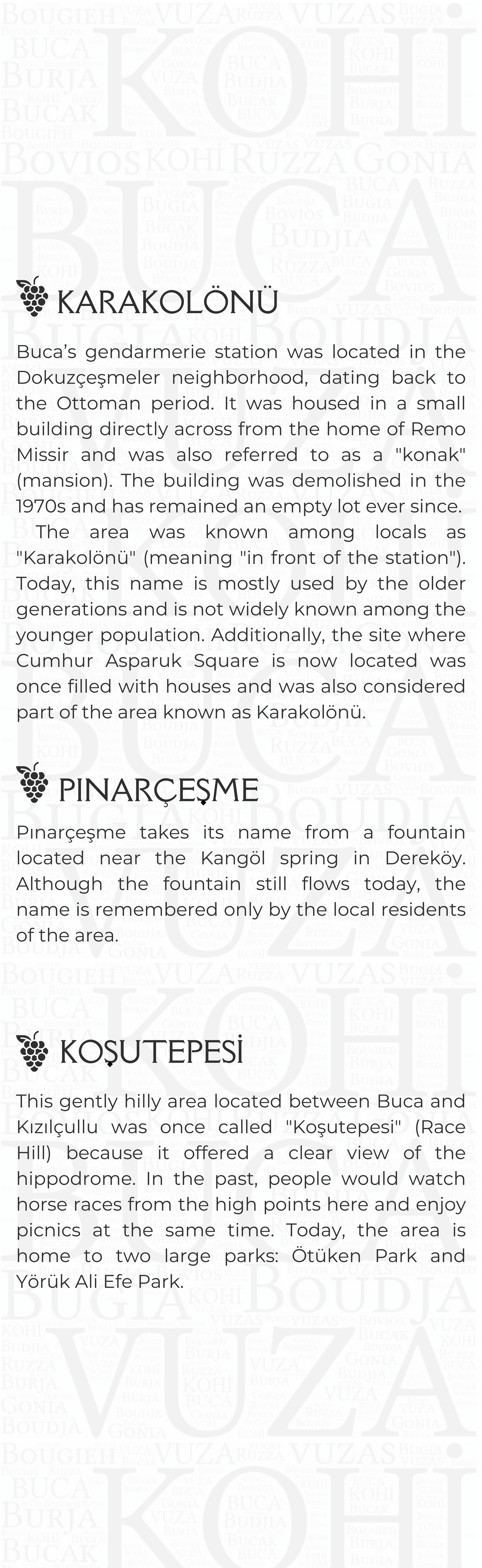 Proje Detayı : Buca'nın kentsel belleğinde izi olan yapıların, değerlerin, eserlerin bu mirası tanıtmak ve yaşatmak amacıyla Pembe Köşk (Buca Belediyesi Kültür Sanat Merkezi) yapısının giriş katında sergilenmek üzere mekanın yerleşiminin ve sergi araçlarının tasarlanması ile içeriklerinin oluşturulması Kentsel Tasarım Müdürlüğü ile birlikte yapılmaktadır.