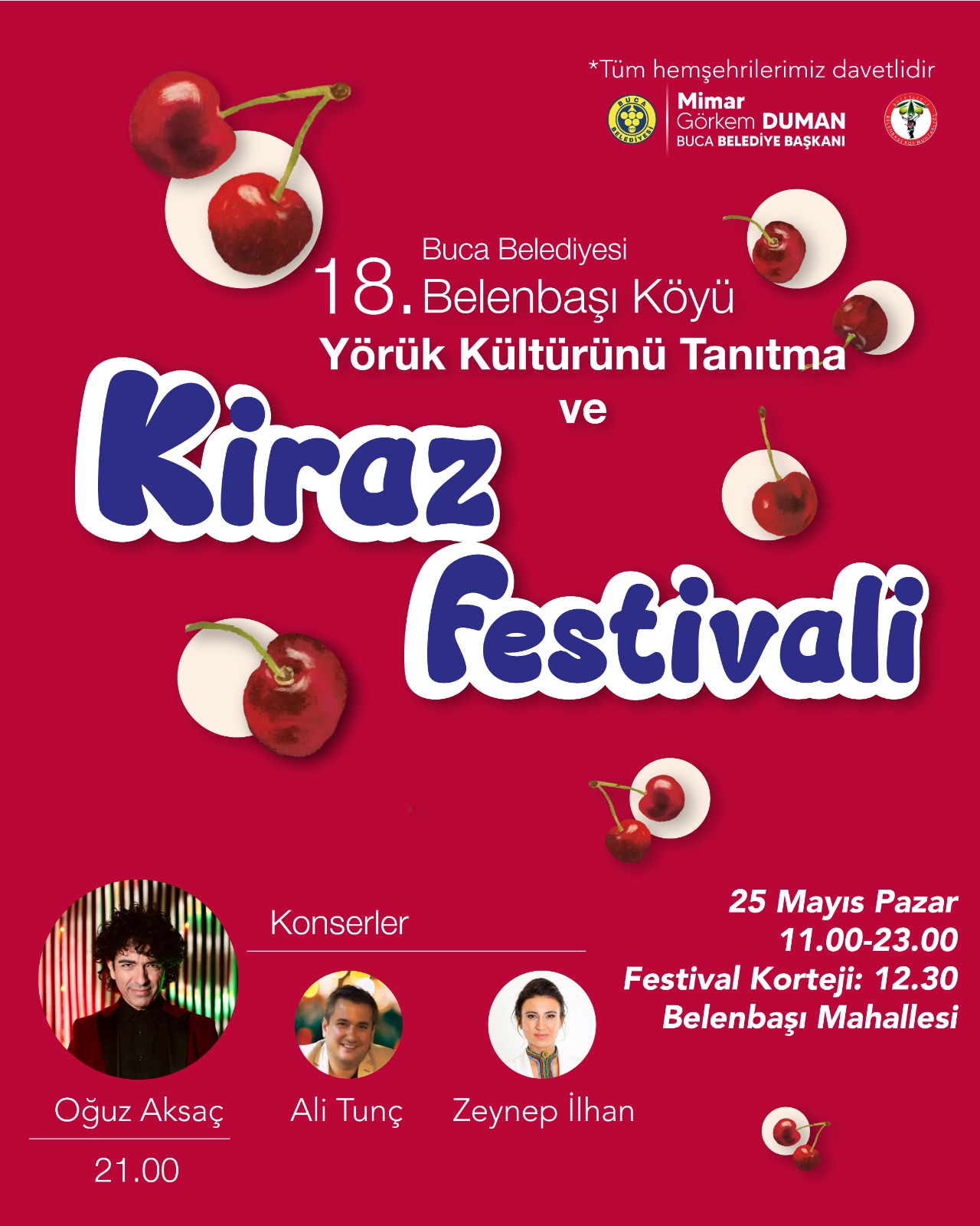 Buca’nın geleneksel Yörük Kültürünü Tanıtma ve Kiraz Festivali, 25 Mayıs Pazar günü Belenbaşı Mahallesi’nde gerçekleştirilecek. Buca Belediyesi ve Belenbaşı Mahalle Muhtarlığı iş birliğiyle düzenlenecek olan festival, saat 12.30’da köy girişinden festival alanına yapılacak kortej yürüyüşü ile başlayacak. Festivalde gün boyu halk oyunları gösterileri, organik pazar, Yörük kültürünü yansıtan el emeği ürünlerin yer alacağı stantlar ve yarışmalar yer alacak. En iyi kiraz yetiştiricisinin seçileceği festivalde, Ali Tunç, Zeynep İlhan gibi yöresel sanatçılar yer alırken saat 21.00’de Oğuz Aksaç’ın sahne almasının ardından festival sonlanacak.