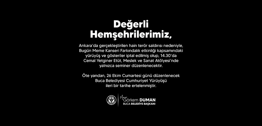 “Ankara’da gerçekleştirilen hain terör saldırısı nedeniyle bugün Meme Kanseri Farkındalık Etkinliği kapsamındaki yürüyüş ve gösteriler iptal edilmiş olup, 14.30’da Cemal Yetginer Etüt, Meslek ve Sanat Atölyesi’nde yalnızca seminer düzenlenecektir. Öte yandan 26 Ekim Cumartesi günü düzenlenecek Buca Belediyesi Cumhuriyet Yürüyüşü ileri bir tarihe ertelenmiştir.
