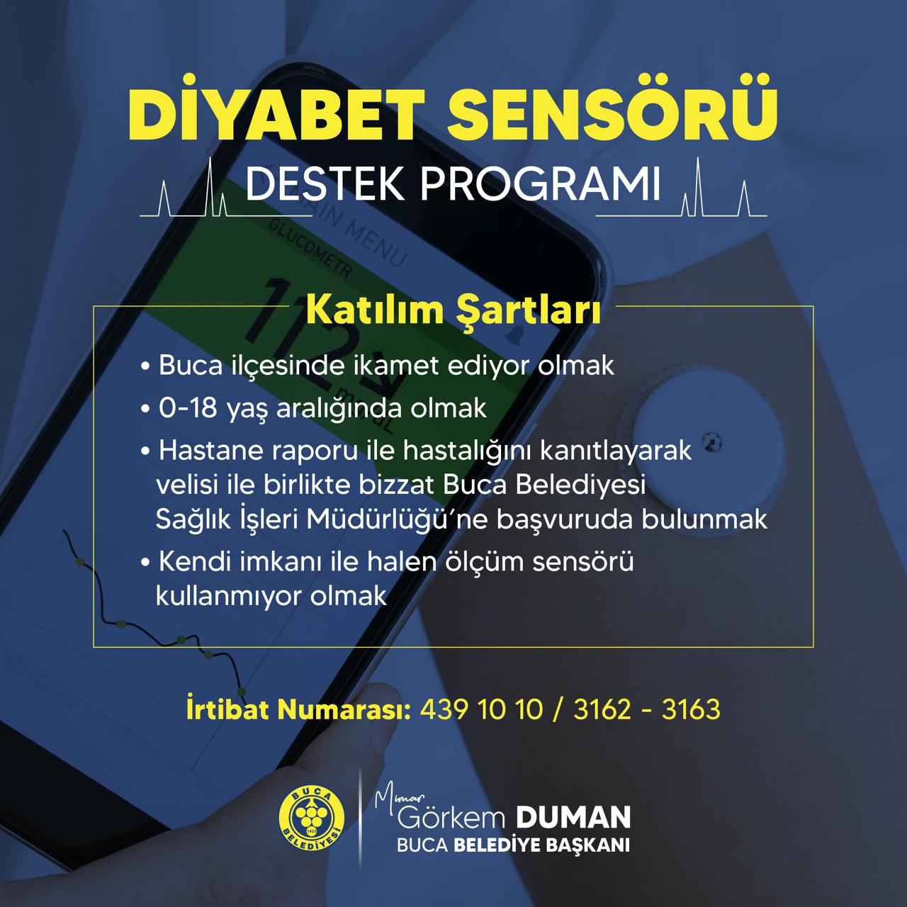 Bucalı vatandaşlara özel uygulanacak Diyabet Sensörü Destek Programı 0 – 18 yaş aralığındaki vatandaşları kapsıyor. Projeden yararlanmak isteyenler, hastane raporu ile hastalığını kanıtlayarak velisi ile birlikte bizzat Buca Belediyesi Sağlık İşleri Müdürlüğüne başvurması gerekiyor. Program ile ilgili detaylı bilgi almak isteyen vatandaşlar 0232 439 10 10 (3162 – 3163) numaralı telefonu arayarak bilgi alabilecek.
