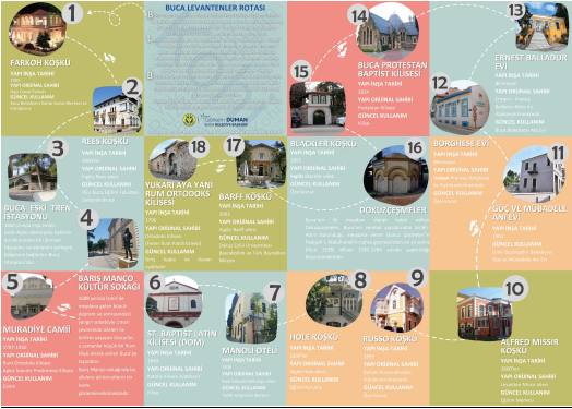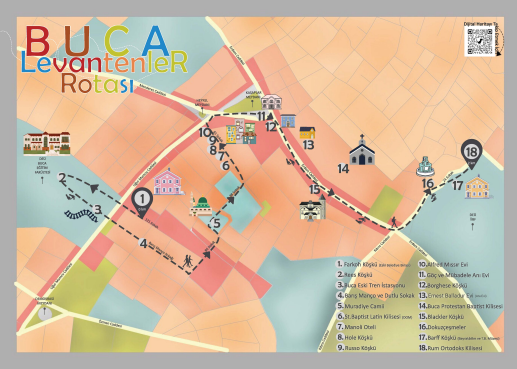 Proje Detayı : Buca Levantenler Rotası Buca Belediyesi Kentsel Aidiyet çalışmalarının ilki olarak, ilçemizdeki tarihi Levanten yapılarını ve Levanten toplumunun Buca’da bıraktığı mimari ve kültürel izleri yerel halk ve ziyaretçiler ile adımlayarak kültürel mirasın korunmasını aynı zamanda kentsel aidiyeti, kentlilik bilincini ve kent kimliğini güçlendirmeyi amaçlayan bir güzergâhtır.